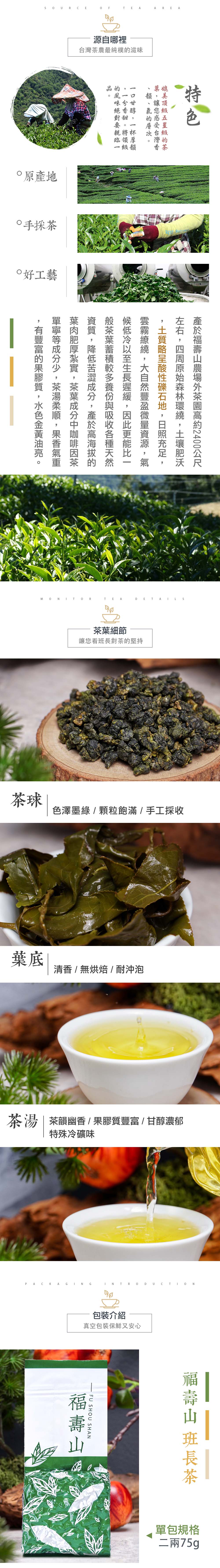 福壽山班長茶 海拔約2400公尺▪ 湯色:金黃油亮▪ 口感:茶韻柔順、淡淡果香氣、甘醇厚實、耐沖泡包裝規格:二兩/75g裝